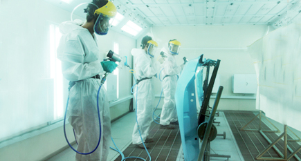 ?。?)噴涂面漆。將調(diào)好的面漆加入噴槍罐中,調(diào)整噴槍的氣壓、出漆量以及噴幅后,開(kāi)始均勻地噴涂在鈑金件上。不同的面漆在噴涂時(shí)的工序也有所不同。