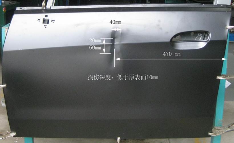 2013年車身修復(fù)大賽受損門板修復(fù)項目技術(shù)方案的補充說明 2013-05-16 19123 2013年車身修復(fù)大賽受損門板修復(fù)項目技術(shù)方案的補充說明 1、受損門板項目的受損位置及尺寸圖片、作業(yè)要求(1)作業(yè)要求在40分鐘內(nèi),對雪佛蘭新賽歐左前門外板上的長80mm,寬40mm,深10mm的條形凹陷(漆膜已破壞)進行修復(fù),凹陷損傷穿過車身線。