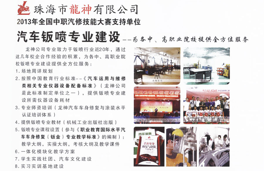 龍神汽車車身修復(fù)與涂裝 水平認證培訓(xùn)體系 2013-06-03 25346 龍神公司專業(yè)致力于鈑噴行業(yè)近20年,通過這幾年校企合作經(jīng)驗的積累,為各中、高職業(yè)院校鈑噴專業(yè)建設(shè)提供全方位服務(wù)。
